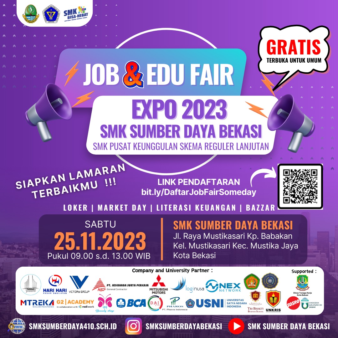 SMK Sumber Daya Bekasi – Sabtu, (18/11/2023). “𝑱𝑢𝑩 & 𝑬𝑫𝑼 𝑭𝑨𝑰𝑹 𝑬𝑿𝑷𝑢 2023 𝑺𝑴𝑲 𝑺𝑼𝑴𝑩𝑬𝑹 𝑫𝑨𝒀𝑨 𝑩𝑬𝑲𝑨𝑺𝑰” Jangan sampai lupa siapkan Surat Lamaran Terbaikmu dan Penampilan Terbaikmu untuk hadir di Job & Edu Fair Expo 2023 SMK Sumber Daya Bekasi pada Sabtu, 25 November 2023 yang akan dilaksanakan di SMK Sumber Daya Bekasi. Silahkan bagi … Baca Selengkapnya