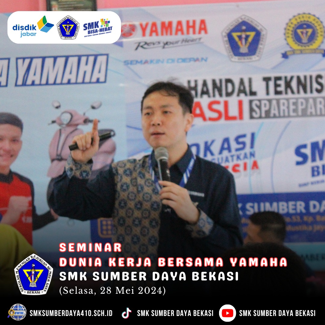 SMK Sumber Daya Bekasi – Selasa, (28/05/2024). Alhamdulillah SMK Sumber Daya Bekasi mengadakan kegiatan seminar dalam menghadapi dunia kerja untuk seluruh siswa/siswi SMK Sumber Daya Bekasi khusus nya kelas XII.   Kegiatan Seminar Persiapan Dunia Kerja dari PT. Yamaha Indonesia Motor Manufacturing (YIMM). Dari pihak Yamaha memberikan motivasi bagi seluruh siswa agar benar-benar matang dan … Baca Selengkapnya